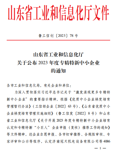 2023年5月9日,山東省工業(yè)和信息化廳公布了《關(guān)于2023山東省“專精特新”中小企業(yè)名單的通知》,經(jīng)企業(yè)申報、市區(qū)審核推薦、專家評審等程序,淄博奧固特科技有限公司憑借優(yōu)越的綜合管理策略和高效創(chuàng)新能力,成功獲評山東省“專精特新”中小企業(yè)稱號。
